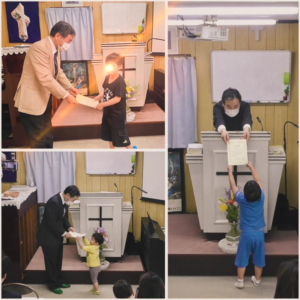 表彰の時がありました。昨年度、教会に来たお友達に来会数が記載されている賞状が贈られました。